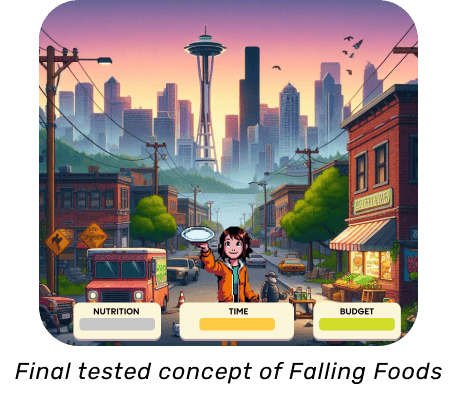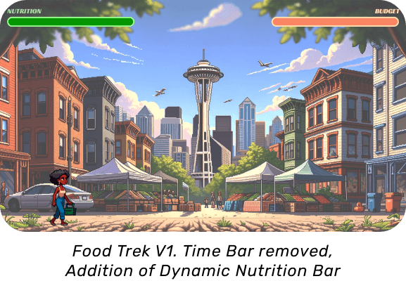 We decided to simplify the interface by eliminating the time bar and introducing a dynamic nutrition bar to encourage active player engagement. By designing the game as a comparative experience each player engages independently while playing simultaneously; encouraging discussions and a deeper understanding of the disparities between each neighborhood for both players.