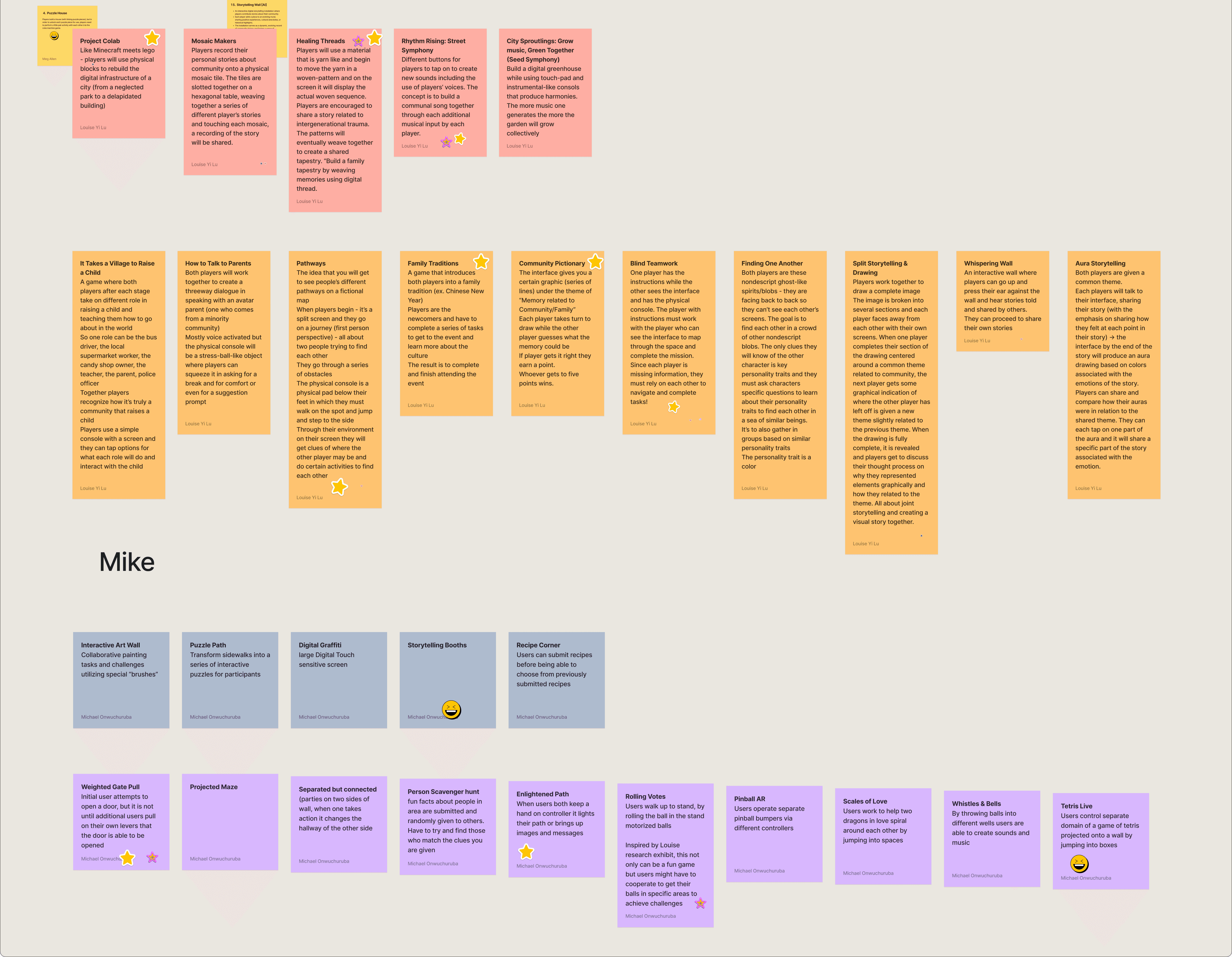 After early individual ideation my team gave pitches for 15 ideas each. Each pitch was based around tying a social impact cause or need to a game concept. After exploring all 60 concepts we used the dot voting method to affinitize and select potential social impact causes