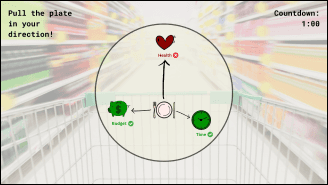 In this sequence players have a much smaller budget in addition to having low rates of moderately healthy foods and no high nutrition foods. This models the external difficulty of both staying nutritious and maintaining a budget in food inaccessible areas. Furthermore the pedals are mounted much further apart forcing the user to work harder to acquire food.